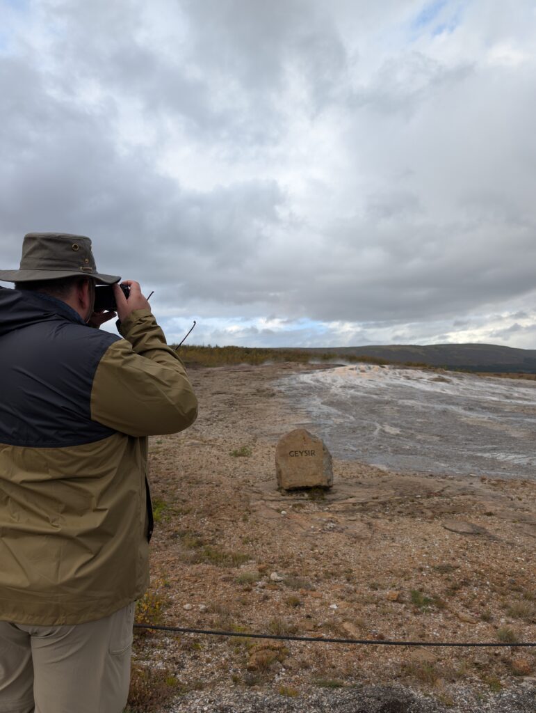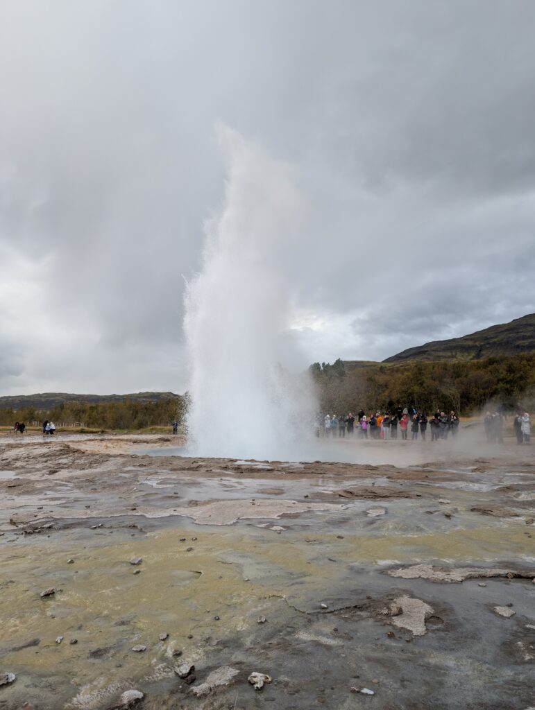 Eine 20 Meter hohe kochende Schwefelbrühe schießt in den Himmel und zieht als Dampfwolke übers Land. Der Strokkur, auf deutsch Butterfass. Es gibt in dem Gebiet noch einige andere blubbernde und dampfende Tümpel, aber der Strokkur ist der derzeit einzige aktive große Geysir in Island. Ein paar Meter weiter ist das Becken des Großen Geysir, Stóri Geysir, des Namensgebers aller Geysire auf der Erde. Der ist aber inaktiv, der tut nix mehr. Ob der Ettl immer noch da steht und auf den Ausbruch wartet?
