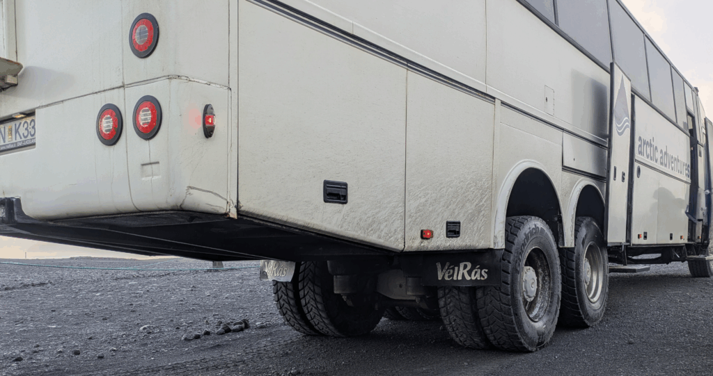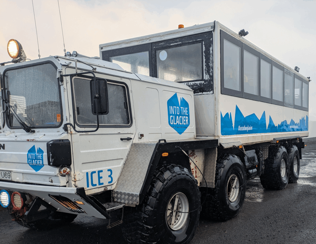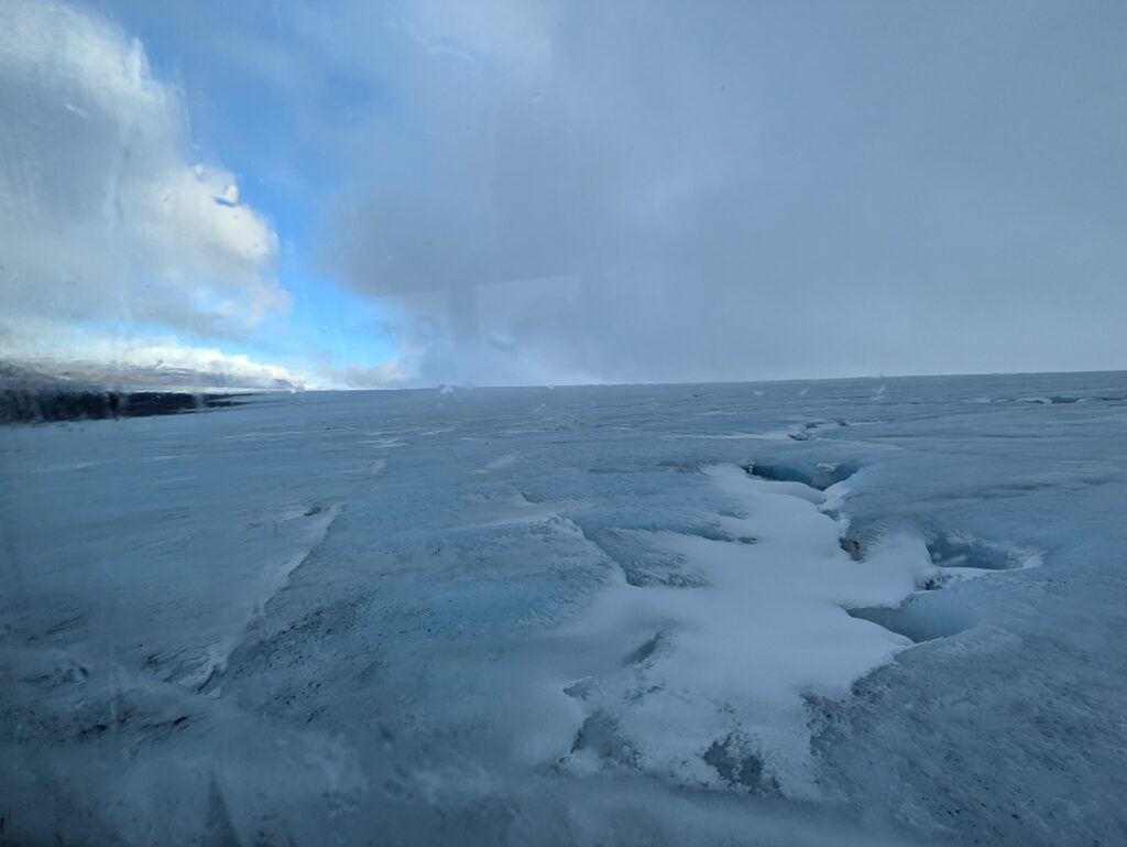 Danach steigen wir in den sogenannten Monstertruck, das ist eine umgebaute mobile NATO-Marschflugkörper-Startrampe. Dort, wo die Rakete war, ist jetzt ein Passagierraum. Das Gefährt ist aus den 80ern und ein Geschenk von Kanada mit der Auflage, es nicht für militärische Zwecke zu nutzen. Es kann während der Fahrt die Luft aus den Reifen lassen, damit es am Gletscher mehr Grip mit den Spikes hat. Und den hat es, das Ding fahrt übers Eis als wär nix. Mit den vielen Rädern und dem Allrad sind ihm meterlange Spalten im Gletscher wurscht.
