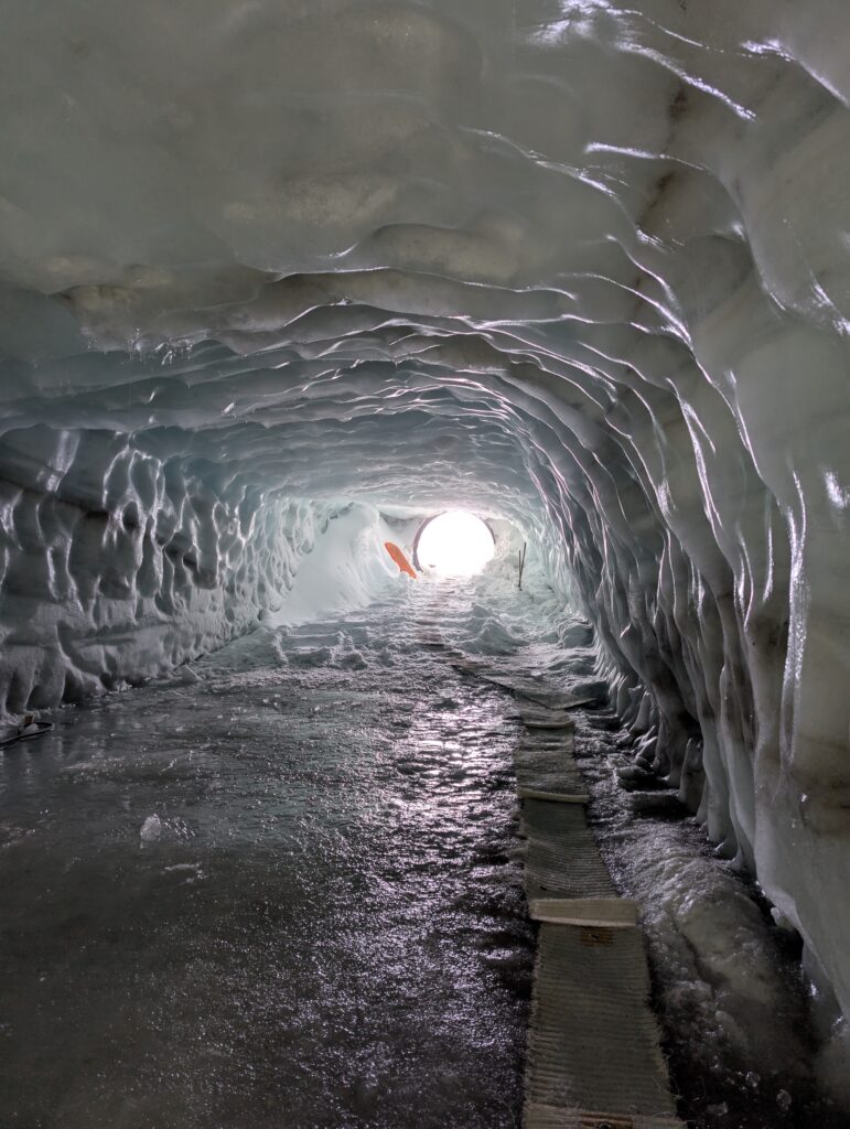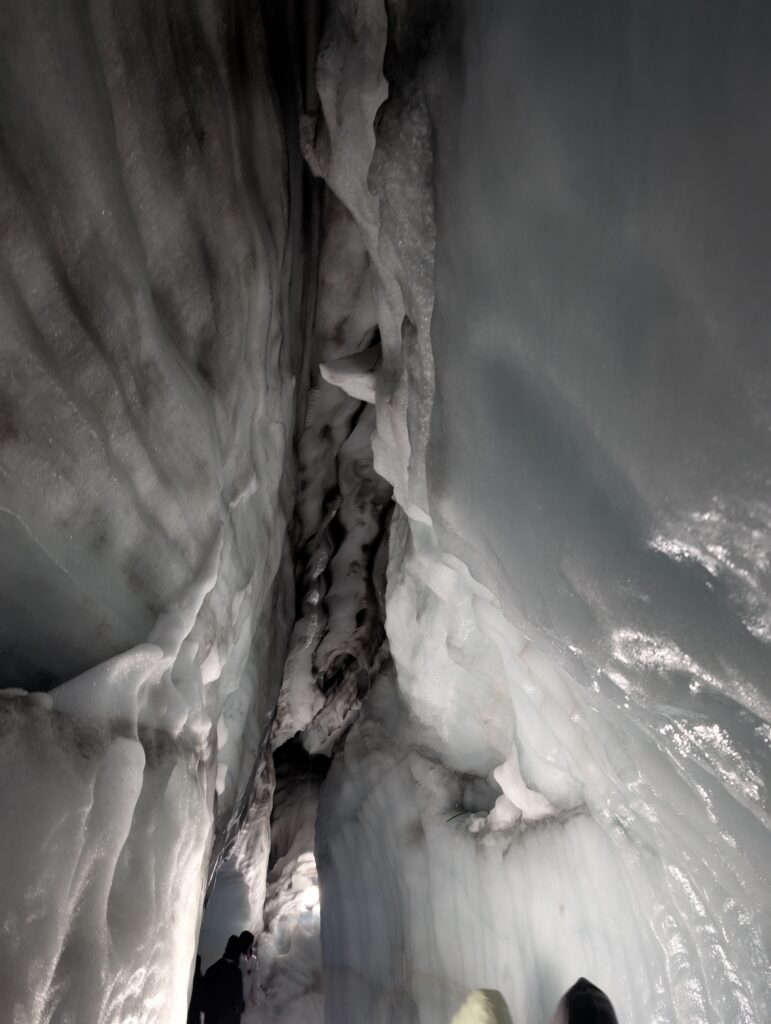 Dann ein Tunnel, nach langwierigen Verhandlungen mit der Regierung 2014 offiziell genehmigt, zunächst mit Schaufeln per Hand gegraben, dann haben sie eine Akku-Bohrmaschine verwenden dürfen. Alles, um dem Gletscher möglichst wenig zu schaden! Der Tunnel muss ständig offen gehalten werden, der Gletscher würde ihn sonst innerhalb von drei Jahren zuwachsen lassen. Man sieht die einzelnen Schichten, das Eis wird immer blauer, je tiefer man ins Innere vordringt. Wir haben unsere eigenen Grödel an, die funktionieren viel besser als die von den Veranstaltern.
