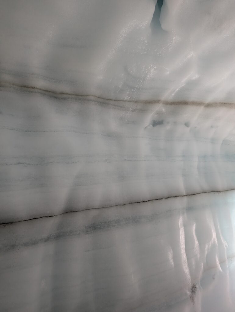 Hier zum Beispiel: der untere dunkle Strich ist die Ascheschicht vom Ausbruch des Eyjafjallajökull im Jahr 2010, der obere Strich ca. 1 Meter drüber ist die Asche vom Jahr darauf. Der Meter Gletschereis entspricht ca. 40 Meter Schnee!