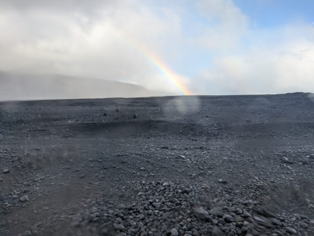 Auf dem Weg rauf gibt es wieder mal den obligatorischen Regenbogen, man sieht auf Island ständig welche. Das Foto ist durch das dreckige Busfenster aufgenommen: